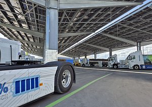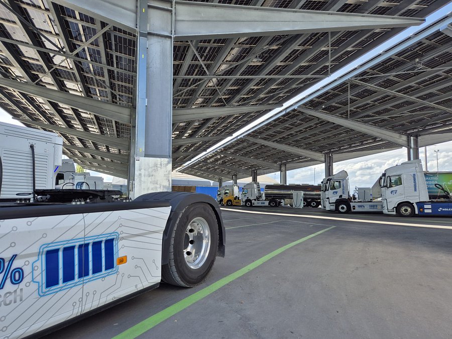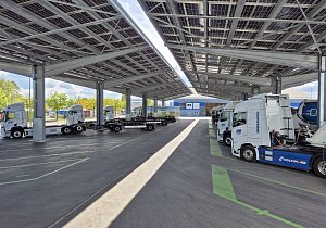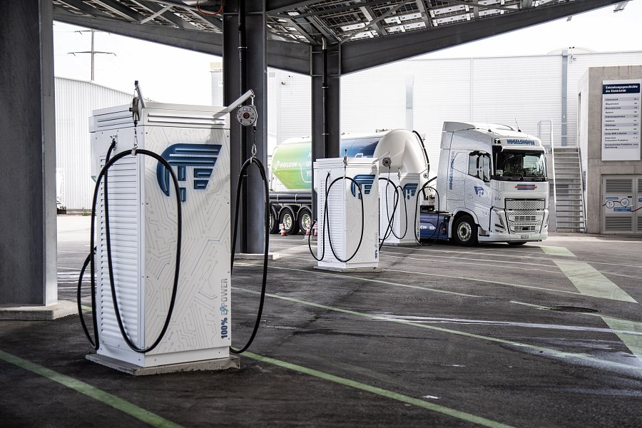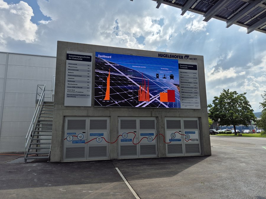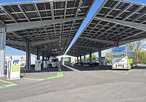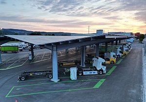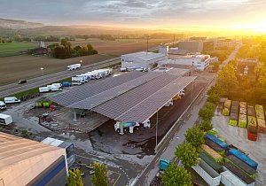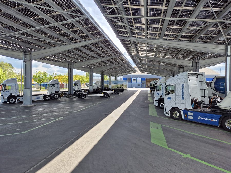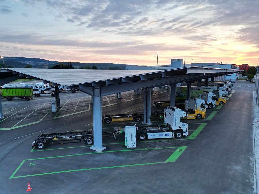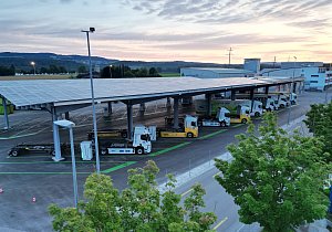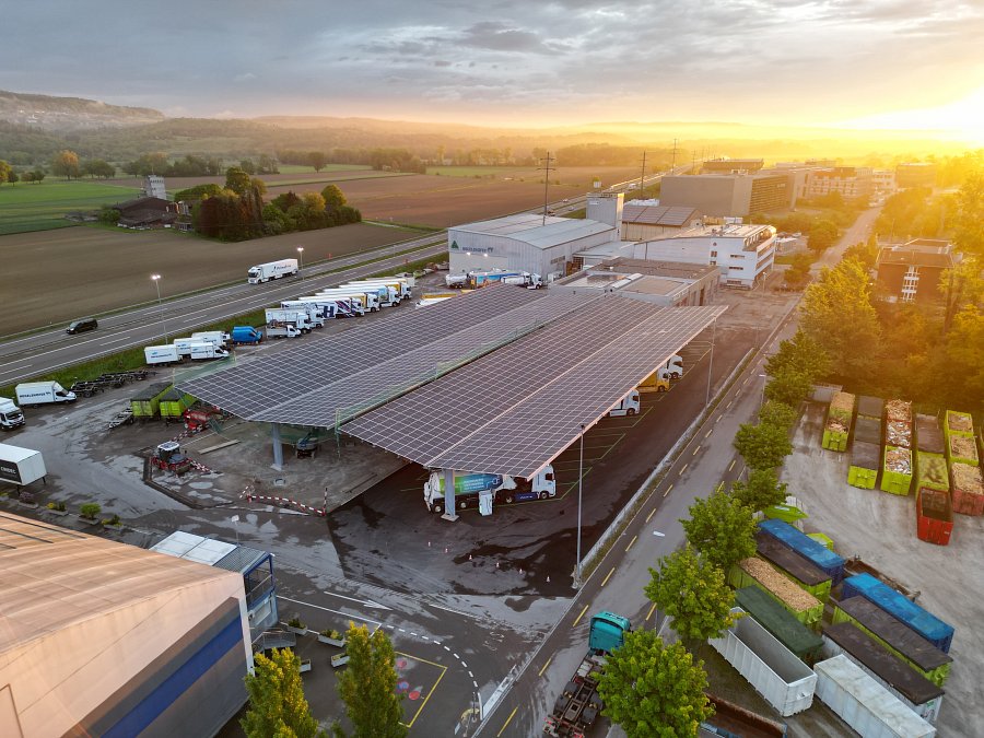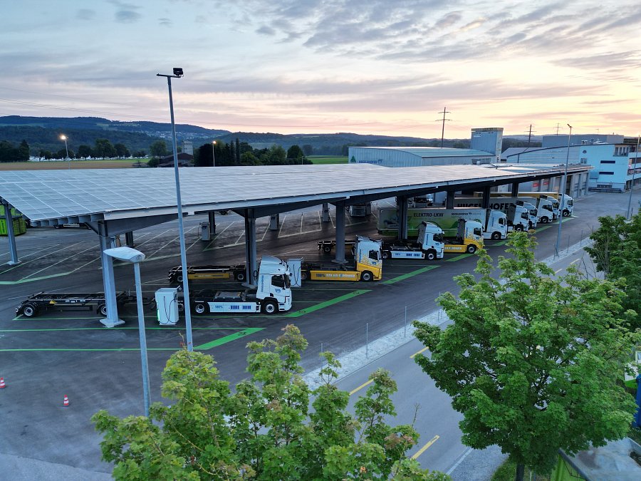 Seit Juni 2024 betreibt Hugelshofer in Frauenfeld einen der grössten Elektro-LKW-Schnellladeparks. Dieser wird durch zwei innovative Photovoltaik-Truck-Ports ergänzt, die mit bifazialen Solarmodulen ausgestattet sind.